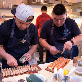 Trifecta Cooks of San José, Calif., graced Los Angeles with its soulful small dish dinner at the Feastly LA loft. Cooking to background sounds by Pat Manaloto aka DJ Flow-Key in a bring-your-own-beverages setting, chefs Lai Chao, Ryan Gallego and Jason Artajos - Bay Area gentleman who comprise the award-winning Trifecta Cooks - served aesthetically delightful and delectable Japanese cuisine.